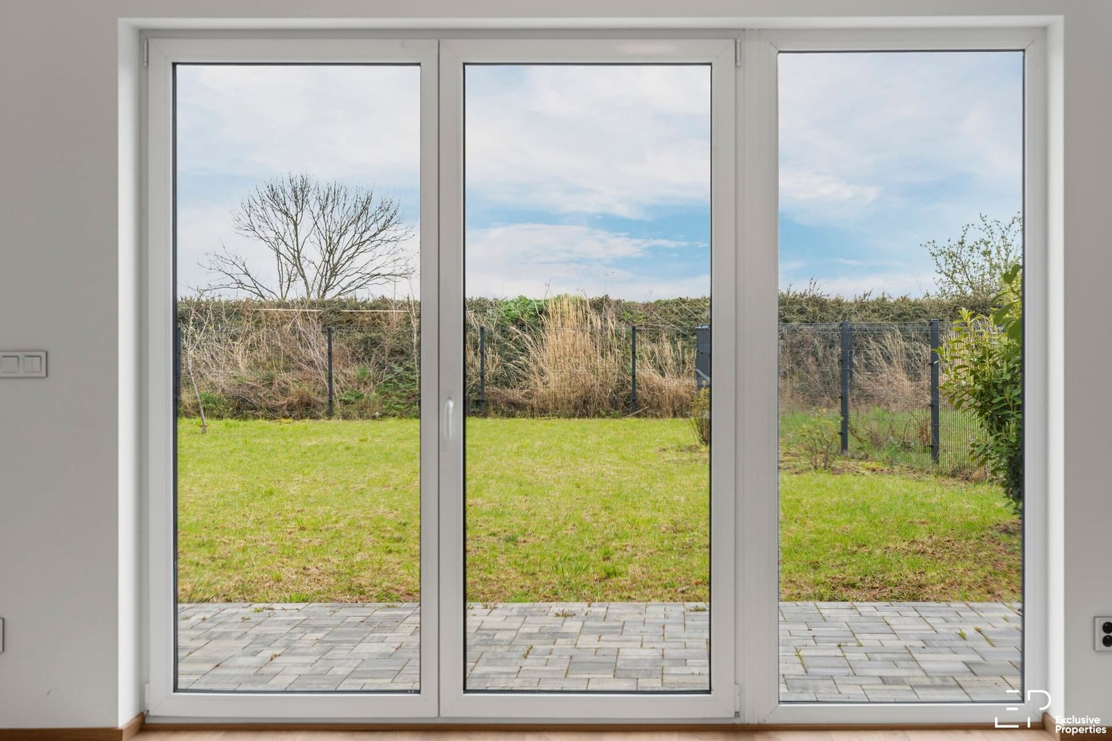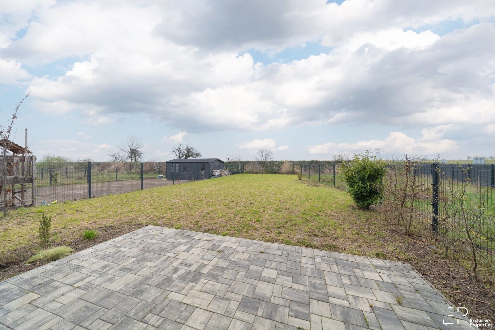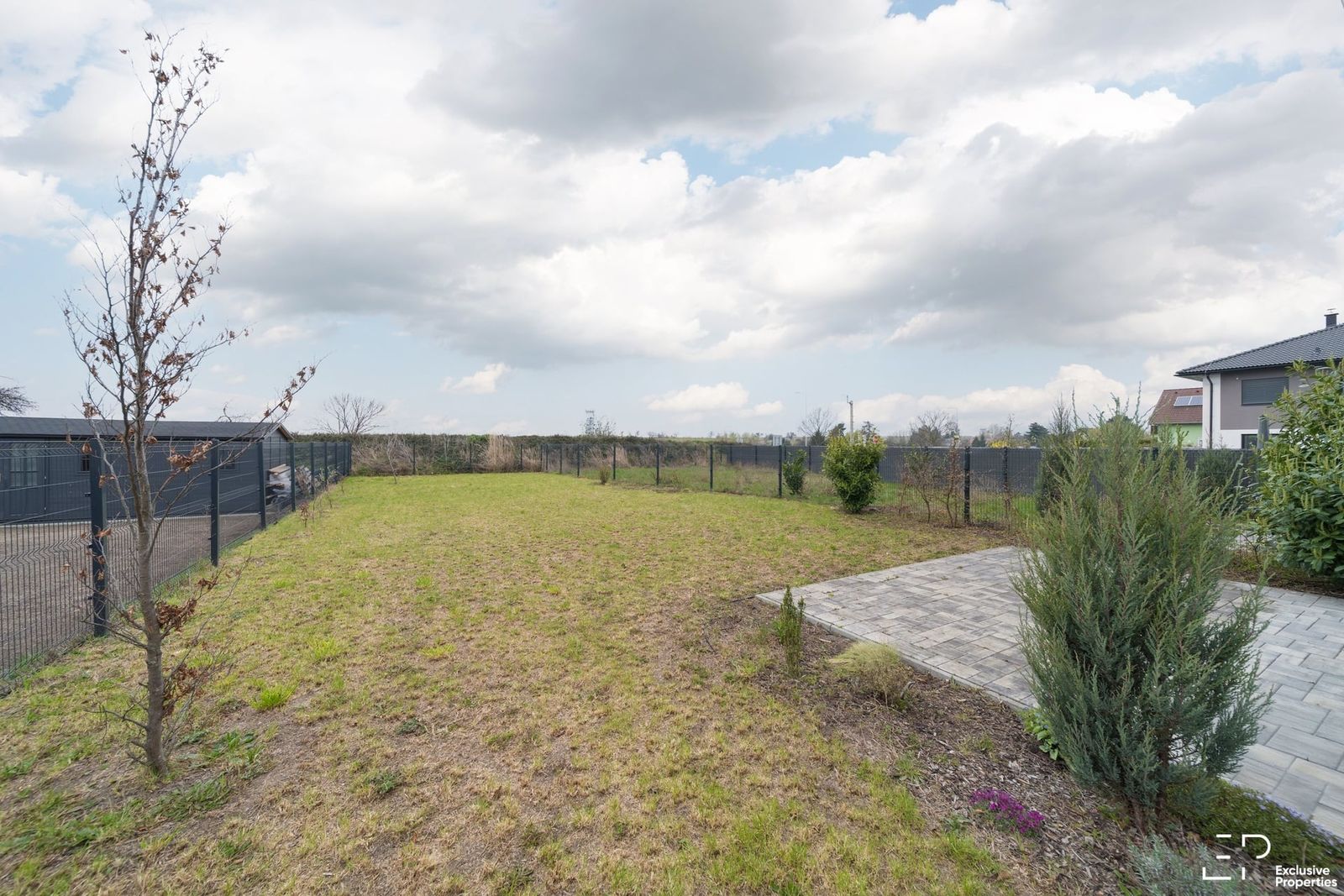 Zahrada je založená (trávník, keře), kompletně oplocená.