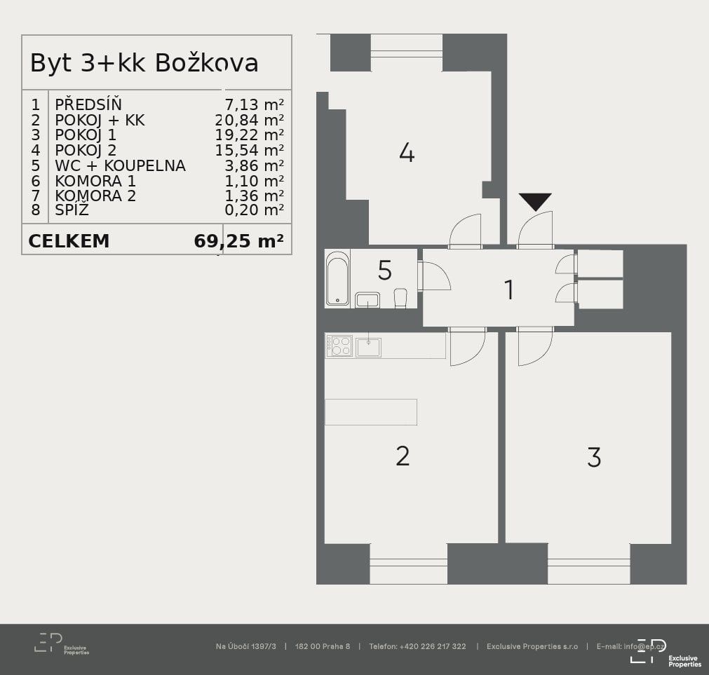Nabízíme k prodeji velmi pěkný a udržovaný byt o dispozici 3+kk s podlahovou plochou 69 m², který se nachází v žádané části Prahy 6 – Dejvice, v klidné Božkově ulici.