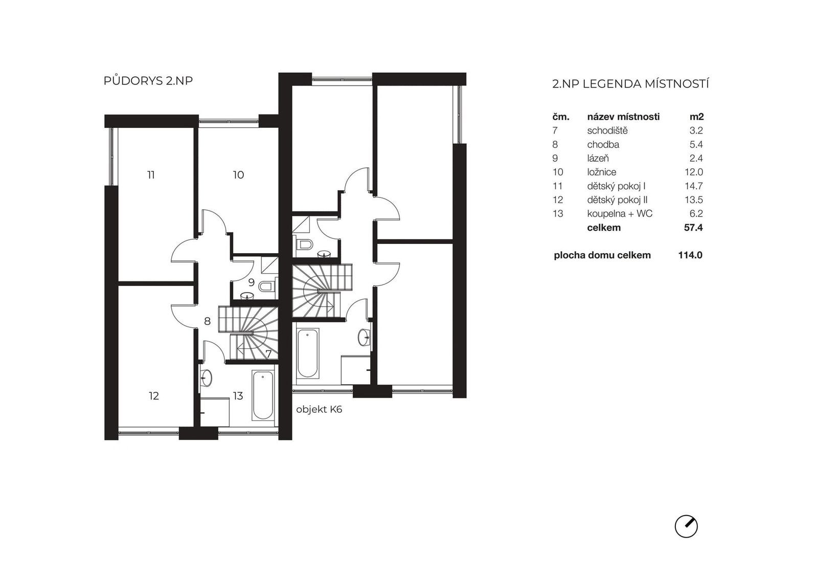 2.NP: samostatné WC s prostorem pro pračku a sušičku, koupelna s vanou a sprch. koutem, 3 ložnice