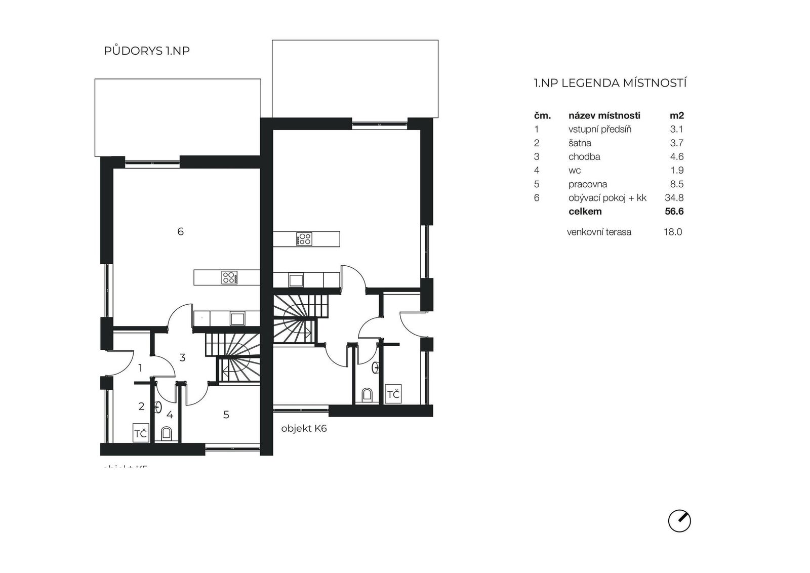 vstup s technologií umístěné mimo manipulační prostor, chodba, samostatné WC, menší pracovna nebo úložný prostor/šatna a vstup do obývacího pokoje, z obývacího pokoje výstup na terasu