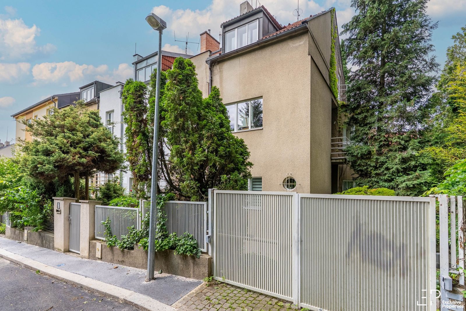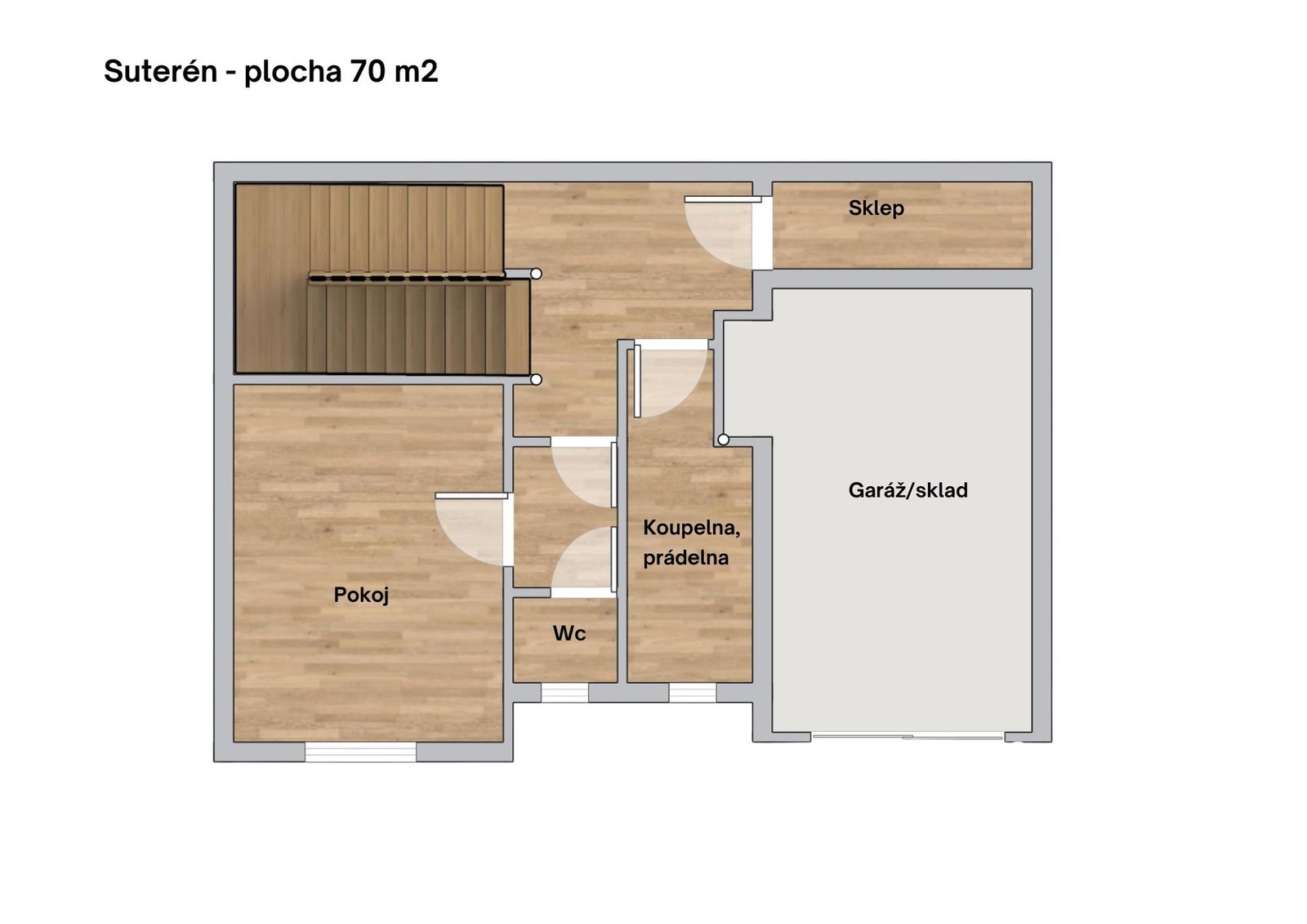 Suterén - Garáž pro 1 malý vůz (16 m2), parkovací místo pro 2 auta na příjezdové cestě. Garážová vrata i vjezdová brána je na dálkové ovládání. Suterénní místnost (studentský byt), toaleta, sprcha, prádelna, sklep. Ze suterénu vstup do zahrady s posezením pod přístřeškem, zahrada (373 m2) se zavlažováním. Kolem domu původní vzduchová ventilace.